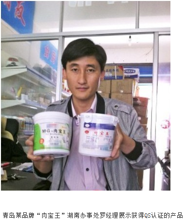 記者隨意走進(jìn)10棟的一家食用化工商行。該商行的進(jìn)門處,放著多箱標(biāo)注產(chǎn)地為青島的“肉寶王”。記者從貨架上拿起一桶正要查看,老板蔡先生循聲從里面走出來,警惕地問:“你是做什么的?”記者表明了身份,表示希望坦誠交流,蔡先生這才放松緊張情緒。“你不曉得,這兩天來我店子里暗訪的記者不止一位,所以我一看你走進(jìn)來,就猜你可能也是記者。”蔡先生說。