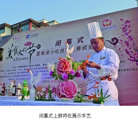 此次美食節閉幕式,不但集中展示了蟹黃湯包、蜜汁藕、麻團、回鹵干等“2012秦淮小吃大賽”的獲獎作品,還現場舉行了“第五屆中國南京美食文化節金陵名廚”大賽。10名來自江蘇酒家、真知味、小廚娘、漢府飯店等知名飯店的大廚,現場以“菊花魚”為題,PK廚藝。