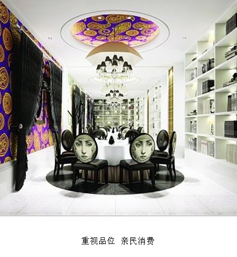 創意川湘菜餐廳呈現時尚、新潮的設計風格,店內家具均以白色皮革箱造型為主,透露出溫馨的歸屬感和留洋小資品位;整體色彩純凈,弧形墻體、剔透的鳥籠及觸手可及迎面撲來雅致的書櫥使空間富于流動和變化;天棚掛懸的小胖白天使裝飾物進一步豐富了視覺空間,卡座以及四周炫目的世界一線奢侈品牌的彩繪圖案,使得店內空間充滿了活力的跳躍感,彌漫著時尚青年向往的留洋生活氣息。