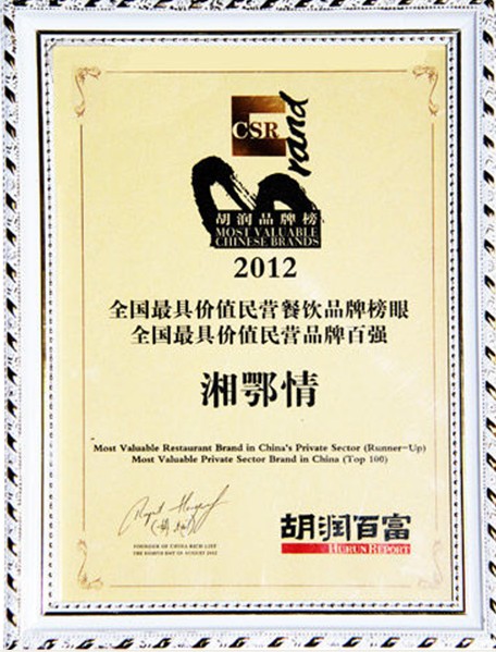 胡潤研究院近日發布《2012中國民營企業品牌排行榜》暨《2012胡潤品牌榜》,榜單對100個中國最有價值品牌按照其品牌價值進行排名。今天記者從湘鄂情集團獲悉,其昨天剛剛拿到2012全國最具價值民營餐飲品牌榜眼的證書。
