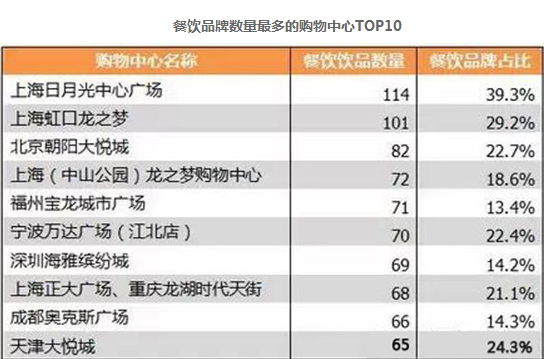 餐飲品牌數量最多的購物中心TOP10