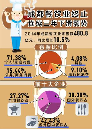 報告顯示,2014年成都餐飲業零售額480.8億元;同比增長10.5%,較2013年6.3%的增速提升了 4.2 個百分點;高于全國(9.7%)0.8個百分點;高于四川省(10.1%)0.4個百分點。