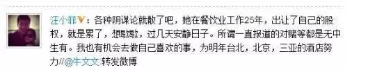 張蘭其子汪小菲曾在微博上轉發《創業家》雜志對張蘭的采訪,并說“她在餐飲工作25年,就是累了,想歇歇”。然而輿論似乎對“對賭協議”更感興趣,他的言論很快被淹沒,并沒有人相信他說了什么。