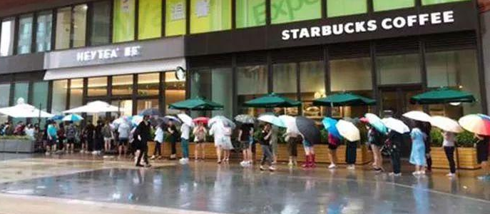 ▲ 購買喜茶的隊伍從星巴克門口經(jīng)過