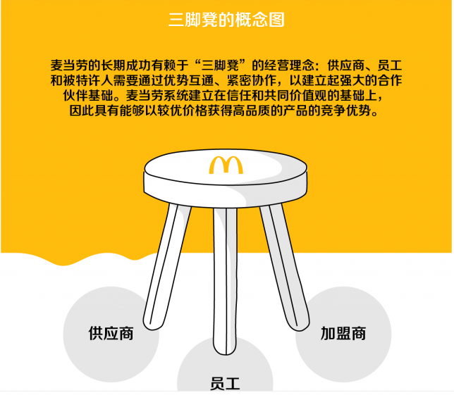 在麥當(dāng)勞著名的“三腳凳”文化中,供應(yīng)商、被特許人和麥當(dāng)勞被視為缺一不可的組成部分,三者在共同的價(jià)值觀(guān)下,優(yōu)勢(shì)互通、緊密協(xié)作。