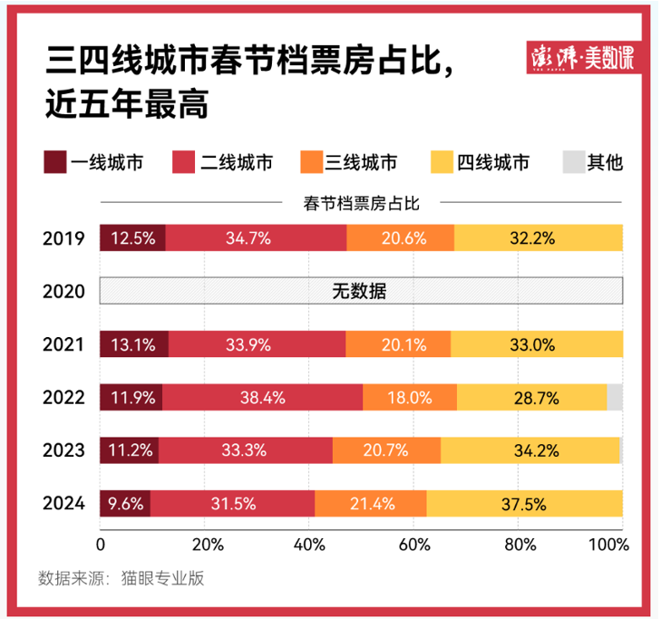 另外,貓眼專業(yè)版數(shù)據(jù)顯示,今年國內(nèi)春節(jié)檔電影市場繼續(xù)下沉。2024年春節(jié)檔三四線城市票房占比達(dá)58.9%,較去年同期提升4個百分點(diǎn)。